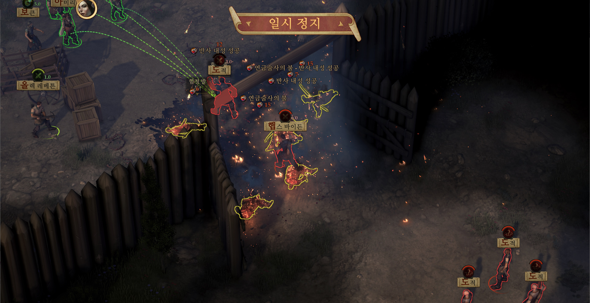 - 팁을 주자면, 연금술사의 불 선택지는 '문 옆에 배치'를 선택하고, 공격을 바로 하지 말고 '타르와 함정' 선택지를 고르는 대신 몇 가지 질문을 하자. (아래 서술한 C위치 및 D위치에서 판정으로 타르와 함정을 설치할 수 있으며, 이 때 경험치 획득 가능하다. 미미하지만..) - [지역 C] 산적이 왔을 때 도망쳤던 NPC(보큰)이 있다. 올렉 레베튼에게 보큰에 대하여 물어봤다면 보큰에게 말을 걸어 도적과 싸울 때 도움을 구할 수 있다.