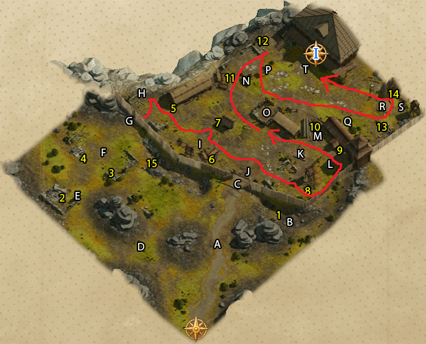 주의 사항: I, J, K, N, Q지역의 마지막 도적은 알림벨을 울리러 가므로, 신경쓰도록 하자. (알림벨이 울리면 보스 팝업)
