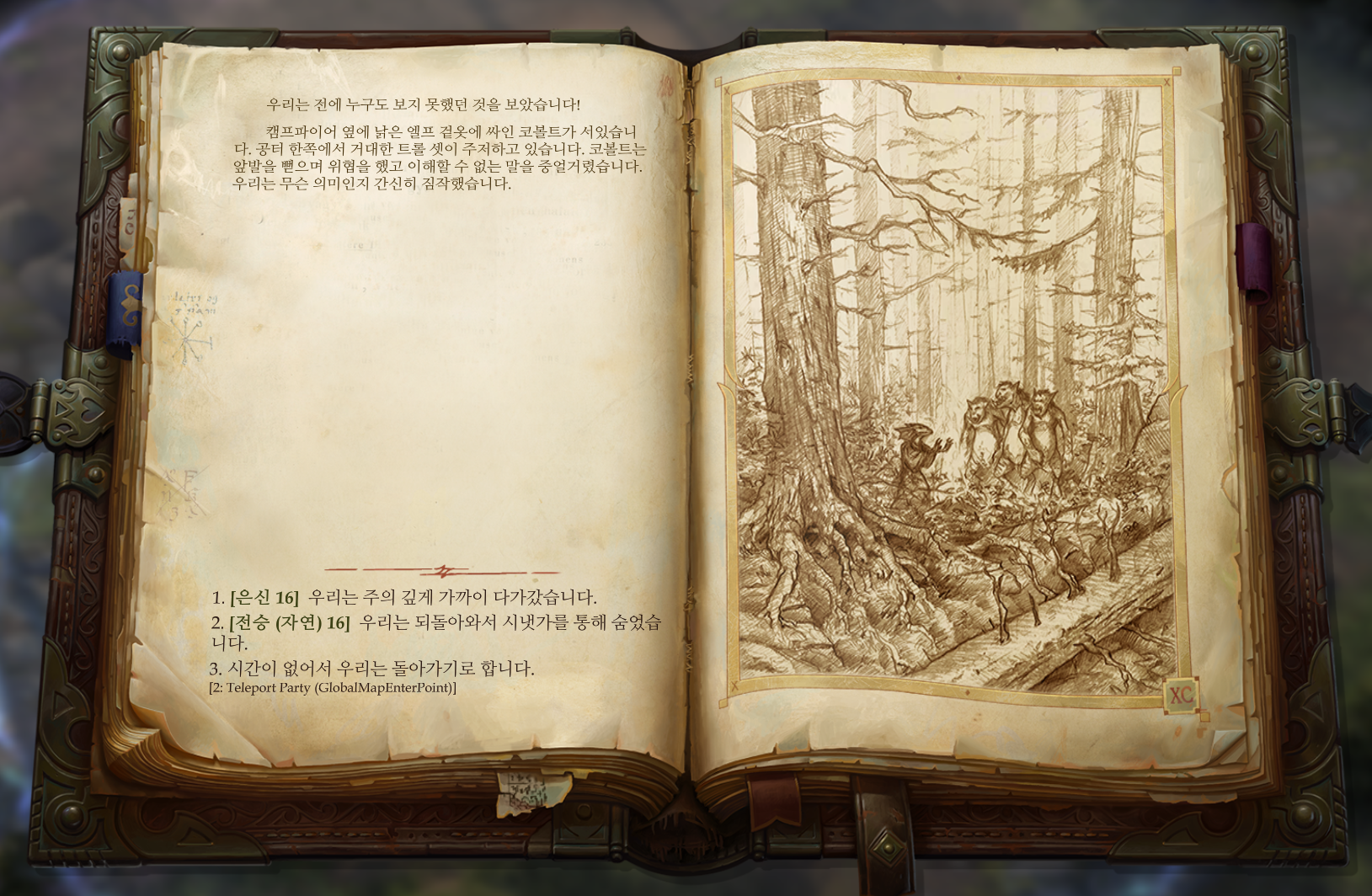 - 첫 번째 페이지: 1, 2 선택지를 실패하면 전투 발생하고 성공 시 두 번째 페이지로 넘어간다.