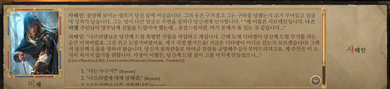 - 왕국 문제를 해결하고 나즈리엘에게 가자. 대화를 하면 나즈리엘은 사르테인을 범인으로 지목한다. 사르테인의 집은 수도 동쪽에 있다(조드 카브켄이 있는 윗집, 선술집 출구 바로 북쪽에 있는 집이다.)