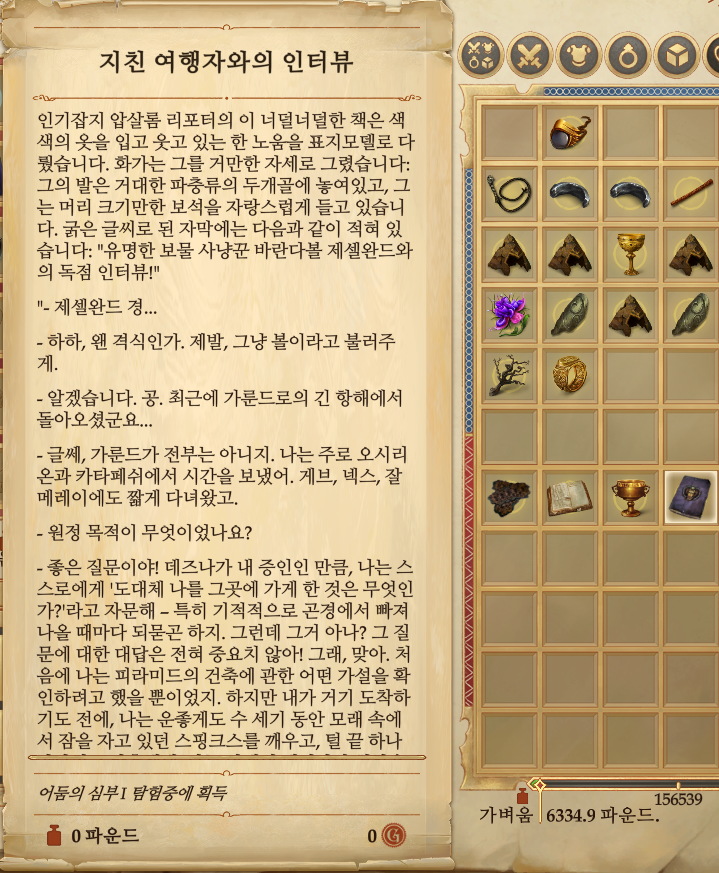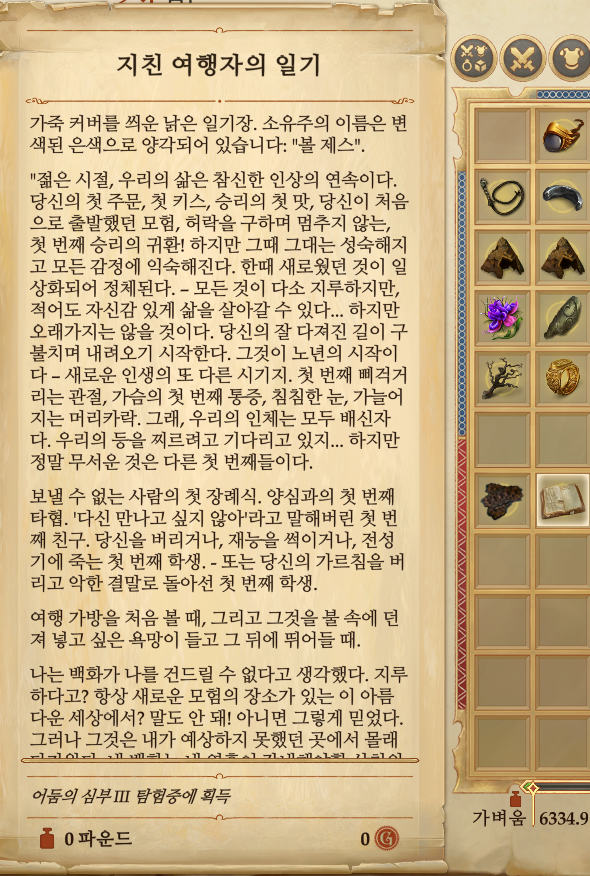 지친 여행자와의 인터뷰(1층 아이템7), 지친 여행자의 머그잔(2층 아이템6), 지친 여행자의 일기(3층 아이템3), 지친 여행자의 낙서(4층 아이템3)