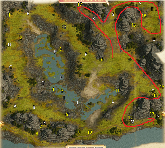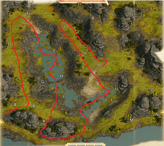 - [지역 S, T] 지역 S에 위치한 함정들을 해제하면서 전진하다보면, 지역 T에서 엠베스 여행자들이 와이번과 싸우고 있다. 이기려면 머리가 2개만 필요하고, 이미 2개가 있으므로 불필요하게 죽이지 않는 것을 추천한다. 이하 스포일러