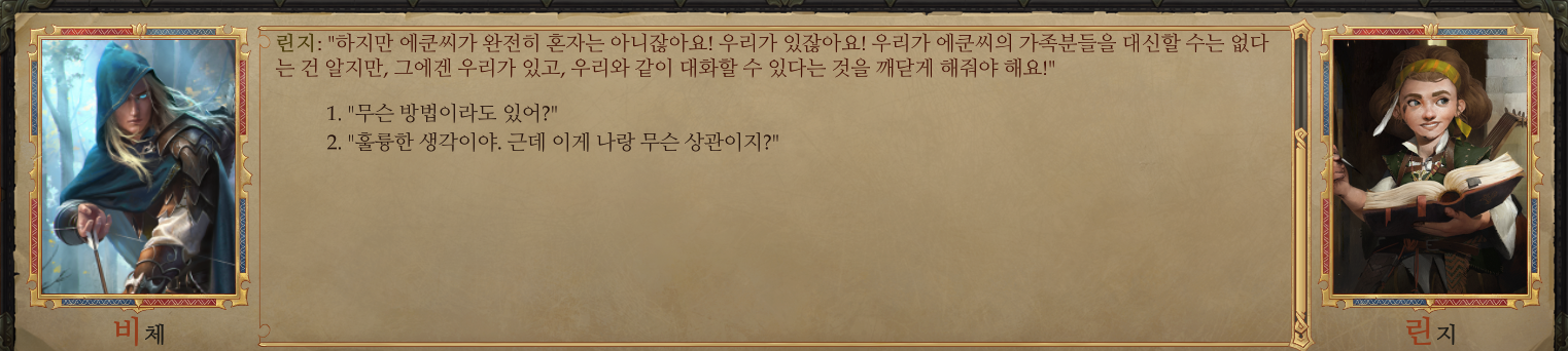 선술집 주인 엘리나와 대화를 하면 대화 이벤트 시작. 에쿤다요의 옛 동료 은타비가 나타나 조언을 해 준다.