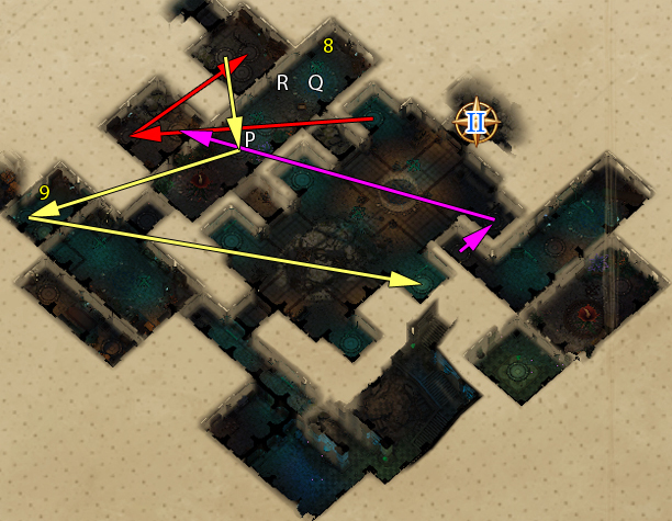 - [지역 R]을 누르면 [지역 Q]에 있던 모바닉 데바가 풀려나면서 좋은 희망 버프를 준다. 이후 제일 아래에 있는 포탈(노란색 선)을 타자.