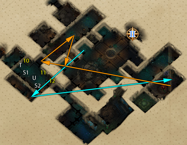 - 하늘색 포탈을 2번 탄 후 주황색 포탈을 타면 [지역 T, U, S1, S2]에 도달할수 있다.