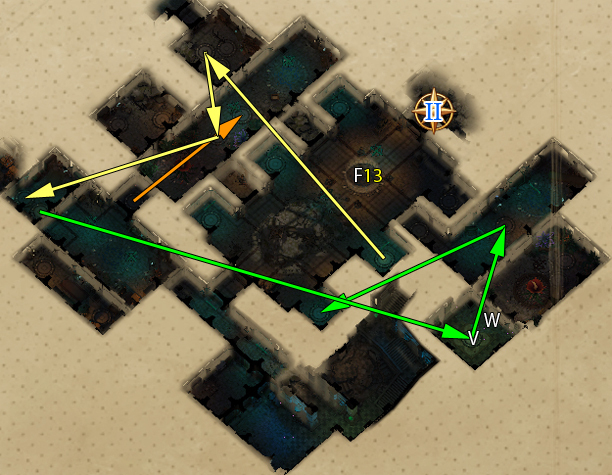 - 노란색 포탈을 3번 탄 후, 녹색 포탈을 1번 타면 [지역 V, W]에 도착한다.