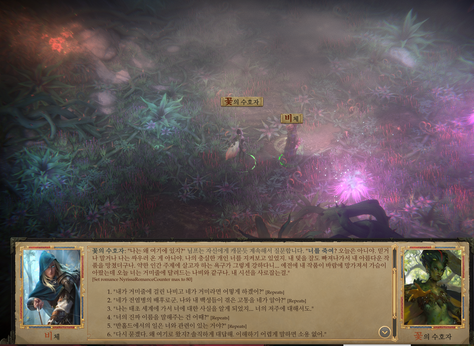 꽃의 수호자 로맨스를 높이고 싶으면 "나는 태초 세계에 가서 너에 대한 사실을.." → "아직 모르지만 알고 싶어.."