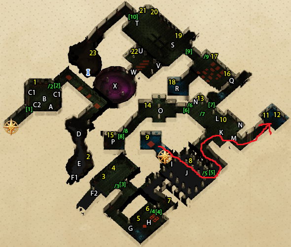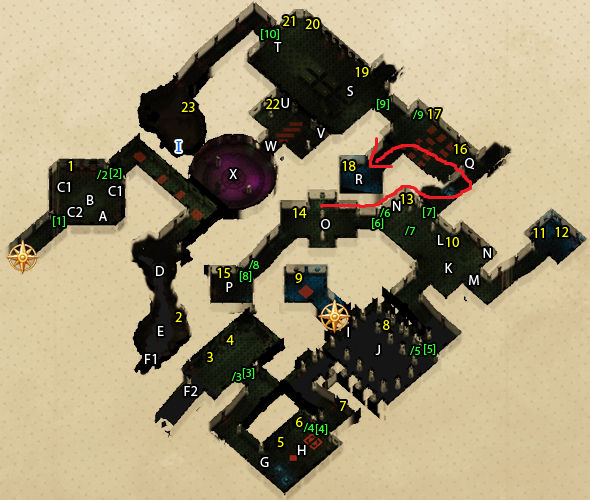 - [지역 N]에 있는 2개의 제단을 활성화하지 않았으면 트랩 활성화, 바로 들어가도록 하자. - [지역 Q] 기동성 DC 23 판정으로 길 넘기