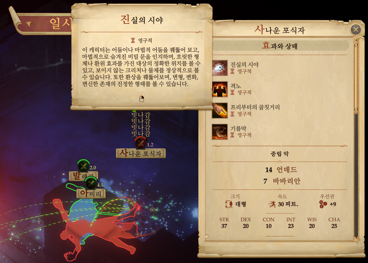 - 3개의 양초가 현재 켜져있는 상황이니, 이 양초를 모두 끄면 [지역 D]에 있는 문이 열리면서 사나운 포식자가 등장한다. (지각 DC 50 체크로 숨겨진 문을 미리 볼 수 있으나, 문을 열 수는 없다.) - 보스 약점은 기름막..정도? 필자 난이도 기준 주문 저항이 30인데, 12렙 옥타비아의 주문 관통이 11이니.. 직접적인 마법류는 거의 불가능하다고 봐야 한다.
