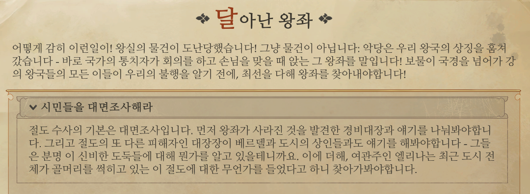 3명에게 말을 걸면 새로운 사건(왕좌 도둑 추적)이 발생한다. 왕국 프로젝트를 수행하도록 하자.