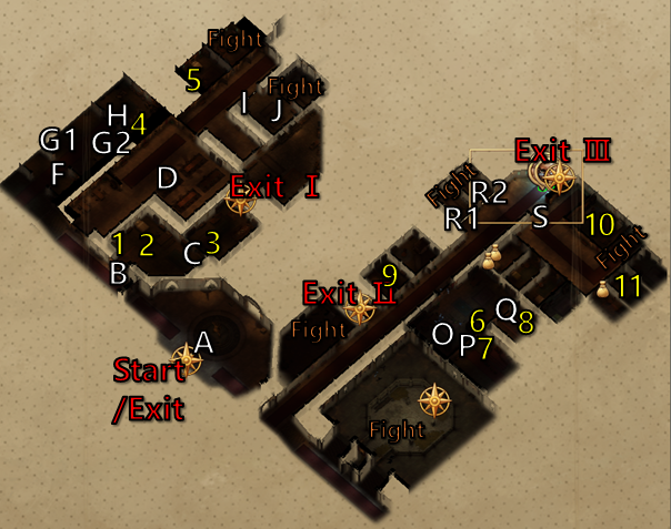 - 주요 전리품: 온실 열쇠, 하늘강철의 조각, 무차별살해자, 자연 방어의 부적 +5, 보호의 반지 +5, 방어의 팔찌 +8 - [지역 E]에 있는 촛대(지각 DC 30)를 상호작용하자. [지역 F]를 넘어가면 모든 황금 골렘이 적대적으로 편한다. 전투 후 남동쪽에서 적들 4마리가 더 몰려오니 의식하고 있자. 전투가 완전히 끝나면 [지역 G1, G2]의 촛대(지각 DC 30)를 상호작용하자. 그러면 숨겨진 문이 열리고 바로 전투 발생.